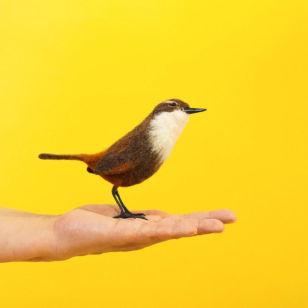 Materiales: Vellón cardado, estructura de alambre, pico de arcilla polimérica y patas recubiertas con floral tape.