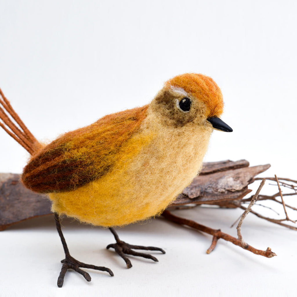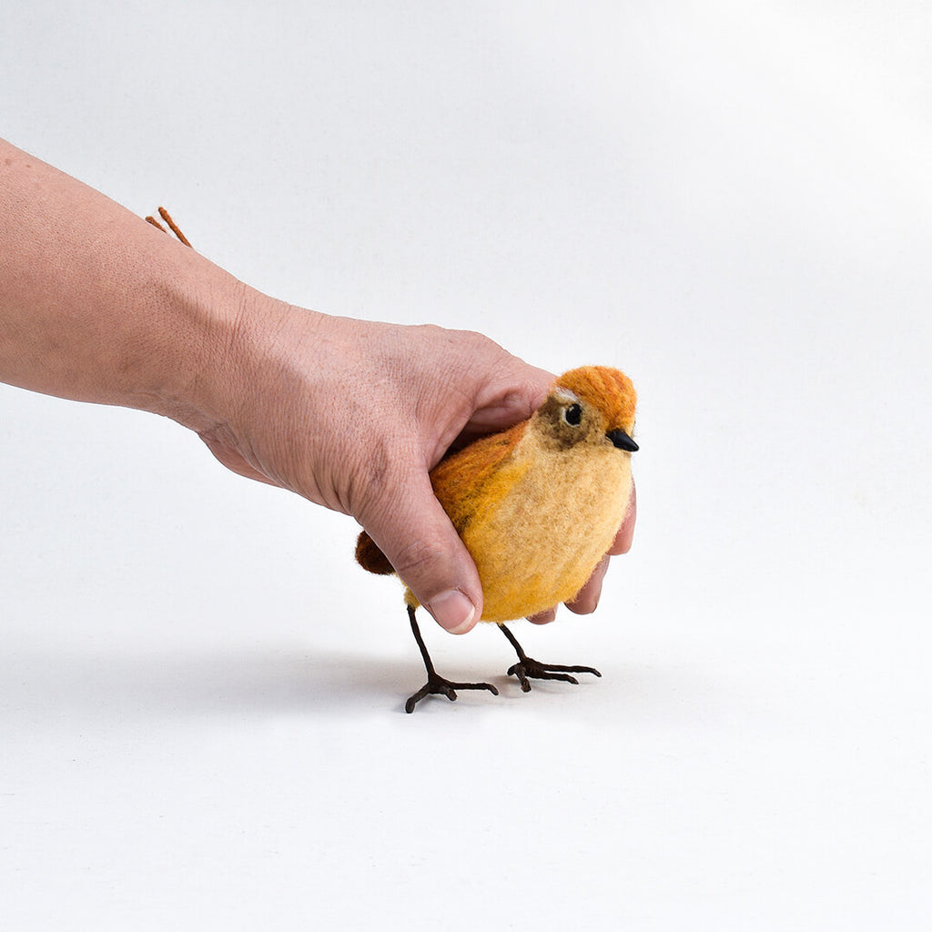 Materiales: Vellón cardado, estructura de alambre, pico de arcilla polimérica y patas recubiertas con floral tape.