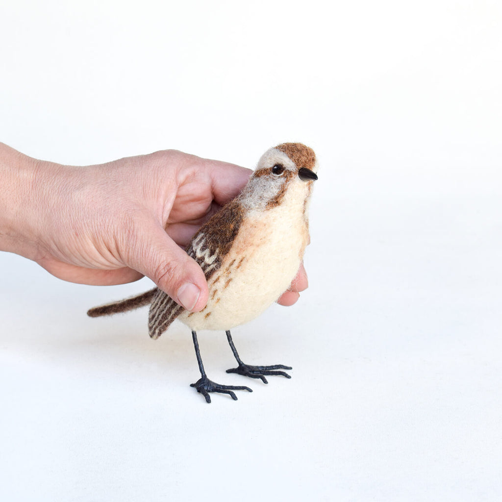 Materiales: Vellón cardado, estructura de alambre, pico de arcilla polimérica y patas recubiertas con floral tape.